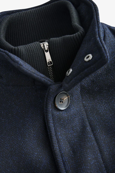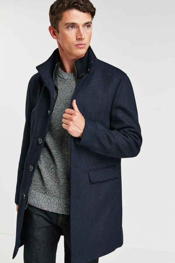 Navy Blue Wool Blend Mock Gilet Herringbone Padded Coat